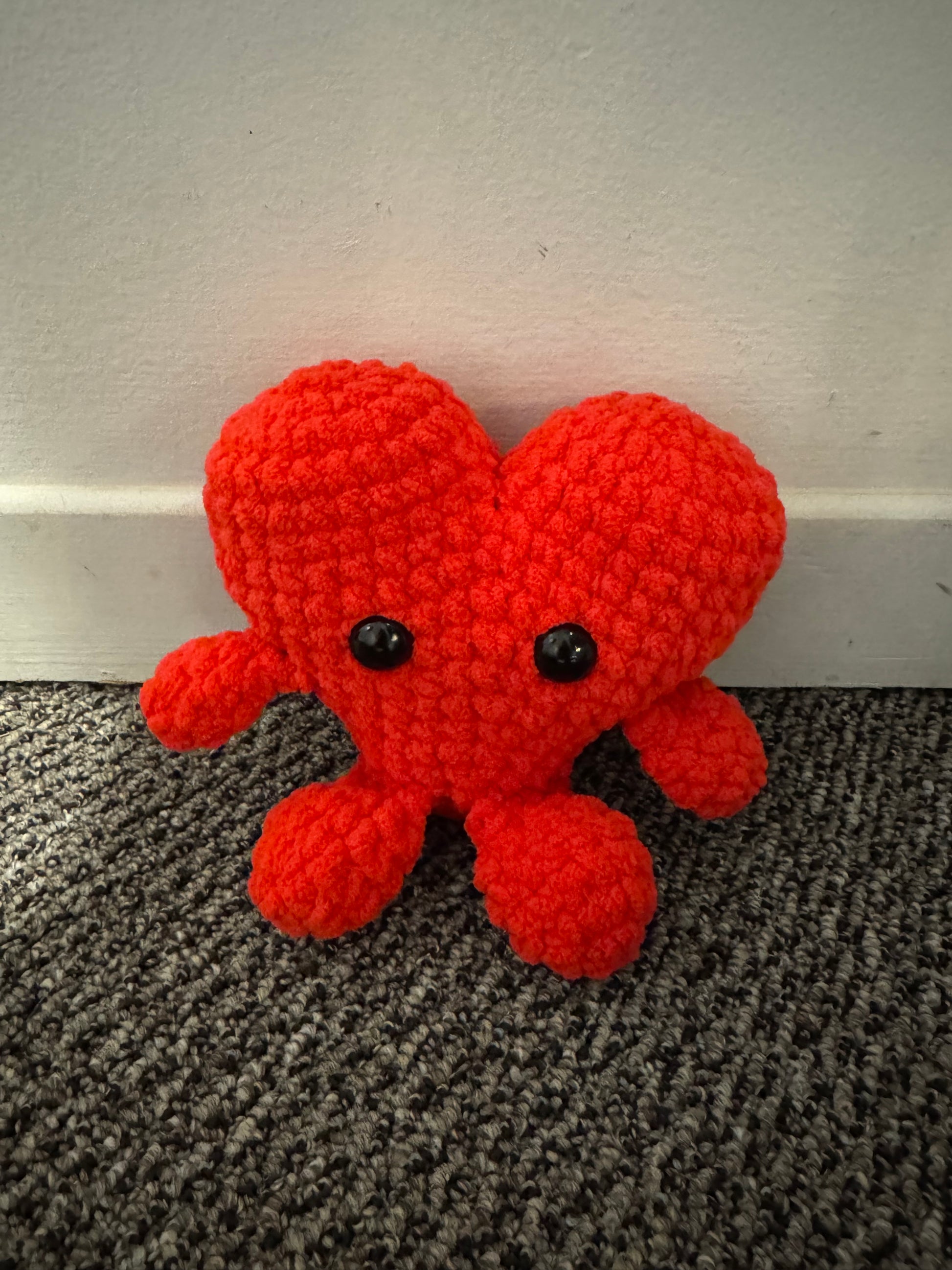Handmade with ultra-soft blanket yarn, this heart-shaped stuffed animal features safety eyes and plush little “feet,” giving it personality and charm. Its squishy texture makes it perfect for display on a shelf, desk, nursery, or Valentine’s Day gift basket.