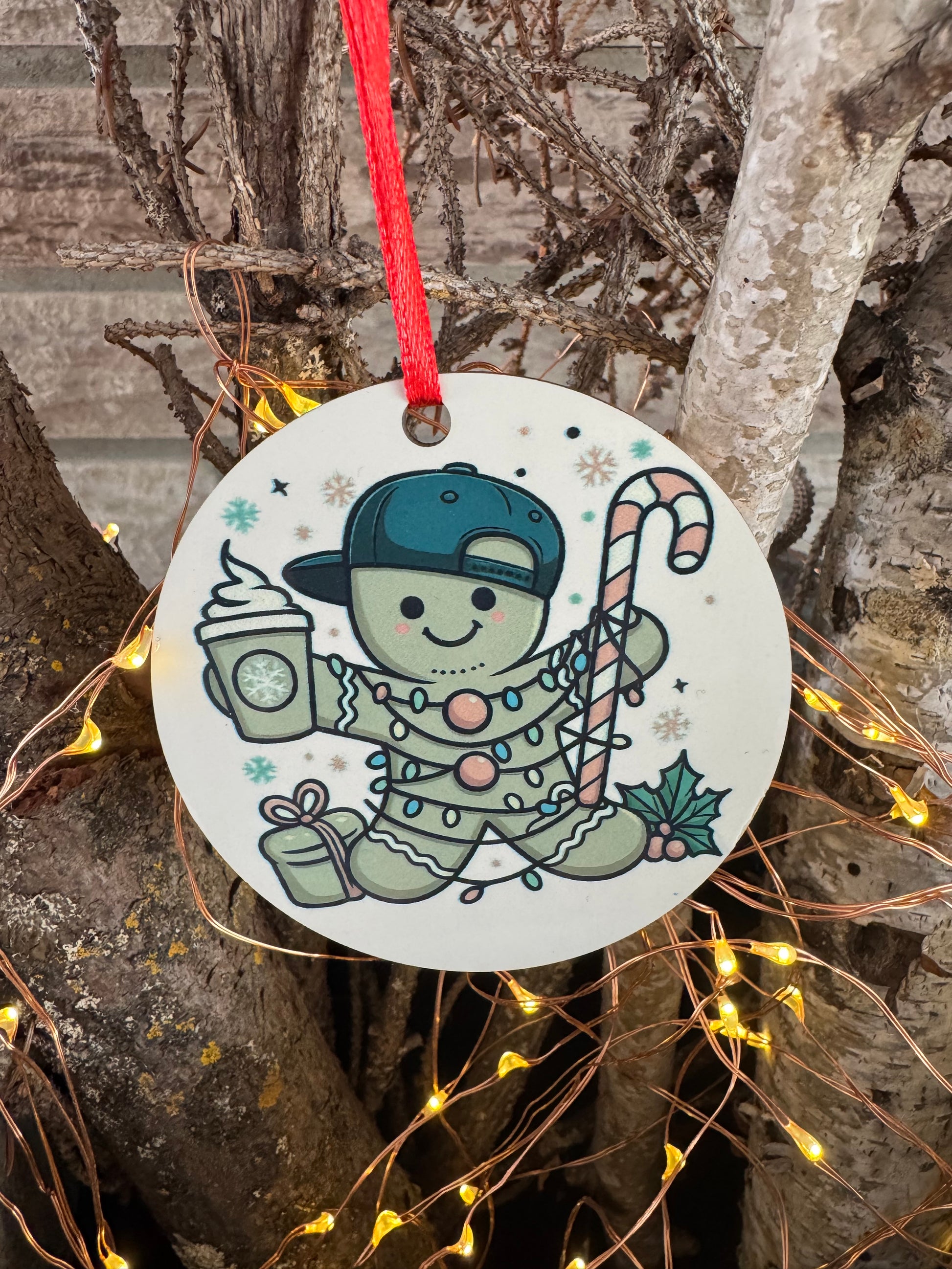 Add a little sweetness to your holiday décor with this adorable gingerbread ornament! Featuring a cheerful gingerbread character surrounded by festive details like holiday lights, a candy cane, cozy winter treats, and seasonal accents, this design brings playful Christmas charm to any tree.